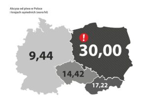 Kolejna podwyżka akcyzy od piwa w Polsce sprawi, że powiększy się różnica pomiędzy stawką akcyzy obowiązującą w Polsce, a stawkami akcyzy w ościennych krajach UE. Już obecnie akcyza w Polsce znacząco przewyższa stawki tego podatku stosowane w Niemczech, Czechach i na Słowacji, i wynosi 28,5 Euro za 1 hl.