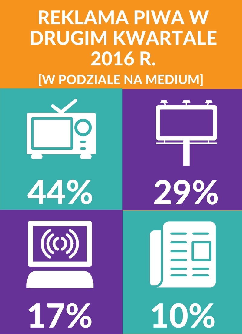 W analizowanym okresie najwięcej reklam piwa pojawiło się w telewizji. Formę telewizyjnego spotu miał blisko co drugi (44 proc.) przekaz reklamowy wyemitowany między kwietniem a czerwcem. Niemal co trzeci (29 proc.) ukazał się za pośrednictwem reklamy zewnętrznej, co dało outdoorowi drugie miejsce w rankingu najchętniej wybieranych przez branżę nośników. Na reklamę piwa mogli również natknąć się internauci (17 proc. przekazów) oraz czytelnicy prasy (10 proc. przekazów).
